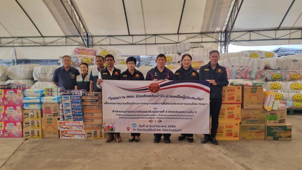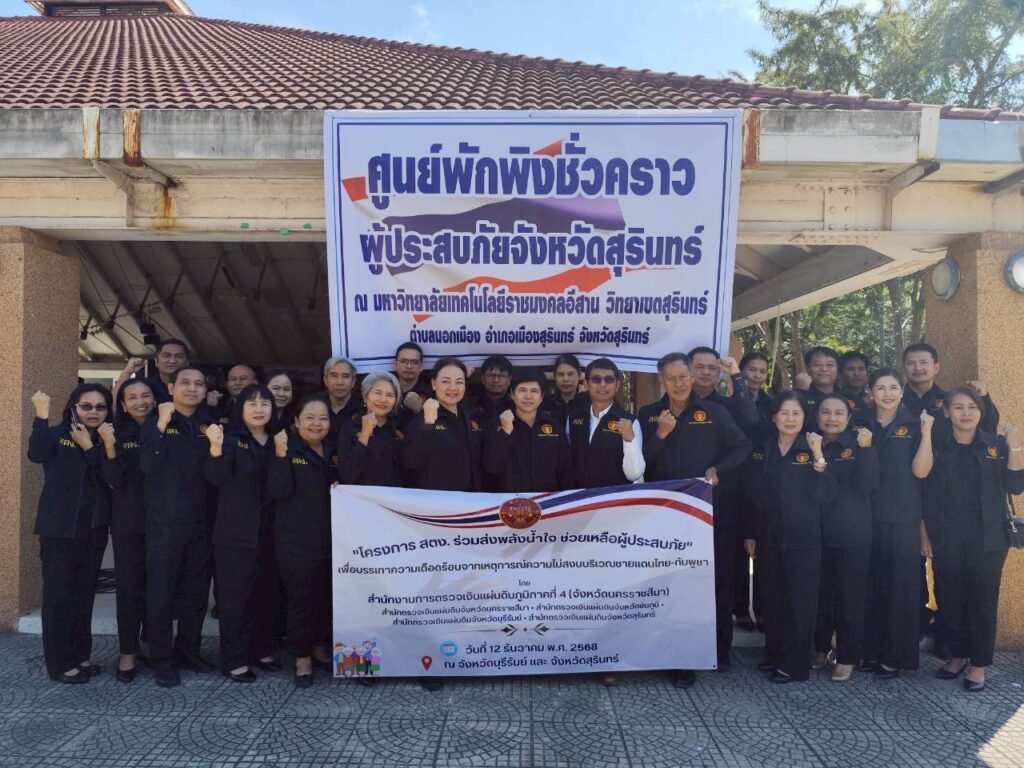 สำนักงานการตรวจเงินแผ่นดินภูมิภาคที่ 4 (จังหวัดนครราชสีมา) โดยนางกชพร เดชธนภัทร์กุล ผู้ตรวจเงินแผ่นดิน (สตภ.4) นางสุภรัตน์ ประสงค์ศิลป์ รองผู้ตรวจเงินแผ่นดิน (สตภ.4) นางกนกวรรณ มวลตะคุ ผู้อำนวยการกลุ่มวิชาการและแผนงาน นางสาวฉวีวรรณ สมานทรัพย์ ผู้อำนวยการกลุ่มบริหารงานทั่วไป นายปริญญา แก้วกุย ผู้อำนวยการกลุ่มตรวจสอบและกลั่นกรอง และนายชัยนันท์ ธงธรรมรัตน์ ผู้อำนวยการสำนักตรวจเงินแผ่นดินจังหวัดชัยภูมิ นายศุภศักดิ์ นาคหนองหาญ ผู้อำนวยการกลุ่มรักษาราชการแทนผู้อำนวยการสำนักตรวจเงินแผ่นดินจังหวัดบุรีรัมย์ นางสาวอรุณี รวดเร็ว ผู้อำนวยการสำนักตรวจเงินแผ่นดินจังหวัดสุรินทร์ และผู้อำนวยการกลุ่ม สำนักตรวจเงินแผ่นดินจังหวัดนครราชสีมา พร้อมด้วยข้าราชการและลูกจ้างในกำกับ ร่วมมอบสิ่งของยังชีพแก่ผู้อพยพเนื่องจากสถานการณ์ การสู้รบแนวชายแดน ไทย-กัมพูชา ณ ศูนย์อพยพสนามช้างอินเตอร์เนชั่นแนลเซอร์กิต อำเภอเมืองบุรีรัมย์ จังหวัดบุรีรัมย์ และศูนย์พักพิงชั่วคราวผู้ประสบภัยจังหวัดสุรินทร์ มหาวิทยาลัยเทคโนโลยีราชมงคลอีสาน วิทยาเขตสุรินทร์ ตำบลในเมือง อำเภอเมืองสุรินทร์ จังหวัดสุรินทร์ ทั้งนี้ มีนายจำเริญ แหวนเพ็ชร ผู้ว่าราชการจังหวัดสุรินทร์ ร่วมรับมอบสิ่งของ โดยรองศาสตราจารย์ ดร.สำเนาว์ เสาวกูล รองอธิการบดีมหาวิทยาลัยเทคโนโลยีราชมงคลอีสาน วิทยาเขตสุรินทร์ ผู้ดูแลศูนย์