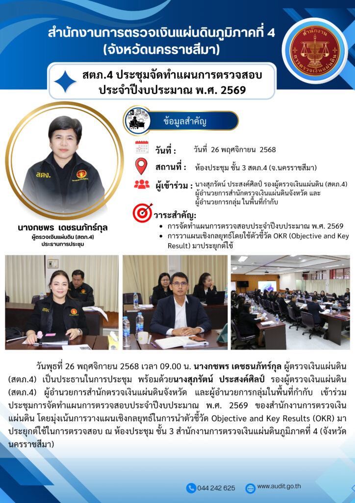 วันพุธที่ 26 พฤศจิกายน 2568 เวลา 09.00 น. นางกชพร เดชธนภัทร์กุล ผู้ตรวจเงินแผ่นดิน (สตภ.4) เป็นประธานในการประชุม พร้อมด้วยนางสุภรัตน์ ประสงค์ศิลป์ รองผู้ตรวจเงินแผ่นดิน (สตภ.4) ผู้อำนวยการสำนักตรวจเงินแผ่นดินจังหวัด และผู้อำนวยการกลุ่มในพื้นที่กำกับ เข้าร่วมประชุมการจัดทำแผนการตรวจสอบประจำปีงบประมาณ พ.ศ. 2569 ของสำนักงานการตรวจเงินแผ่นดิน โดยมุ่งเน้นการวางแผนเชิงกลยุทธ์ในการนำตัวชี้วัด Objective and Key Results (OKR) มาประยุกต์ใช้ในการตรวจสอบ ณ ห้องประชุม ชั้น 3 สำนักงานการตรวจเงินแผ่นดินภูมิภาคที่ 4 (จังหวัดนครราชสีมา)
