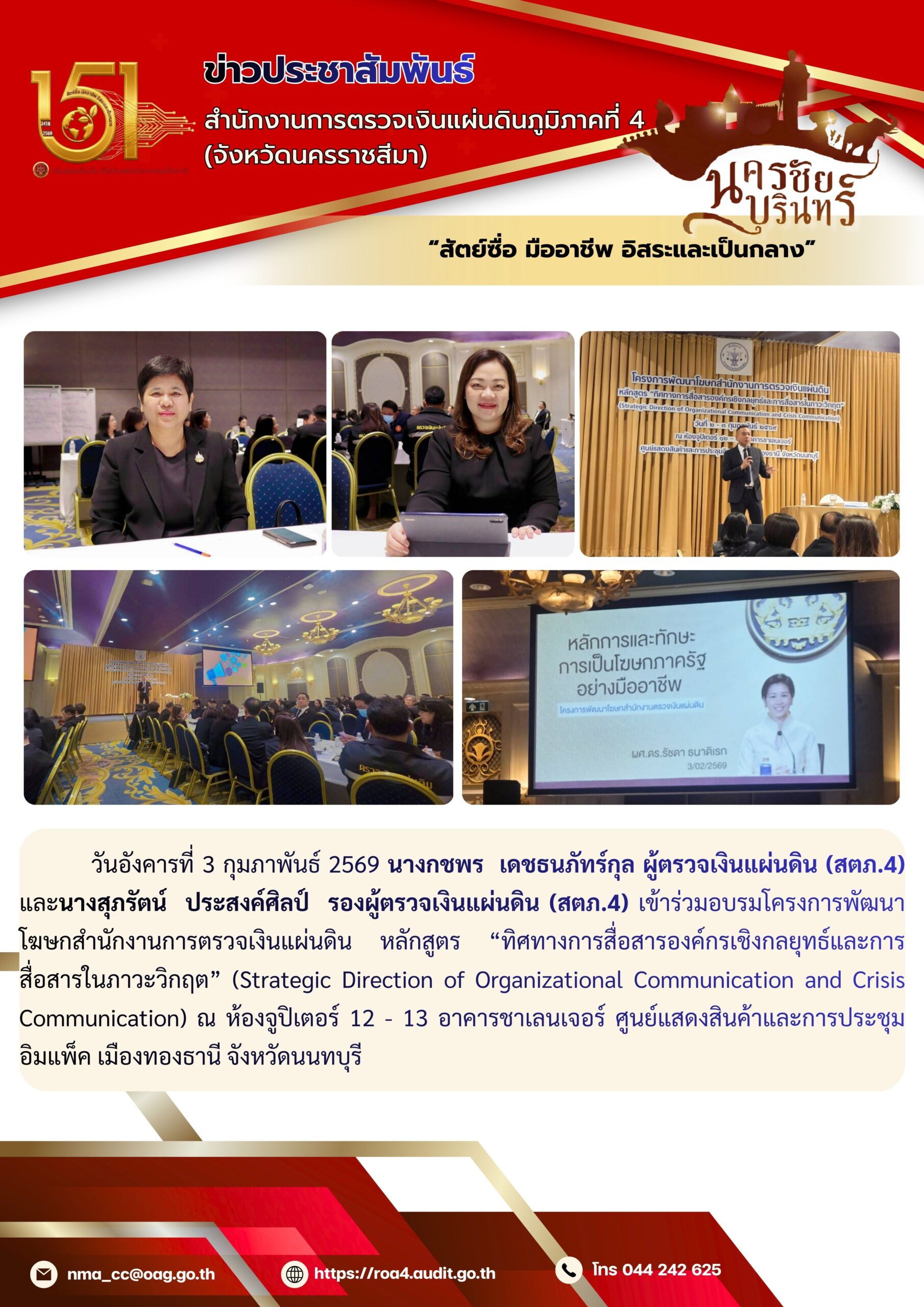วันอังคารที่ 3 กุมภาพันธ์ 2569 นางกชพร เดชธนภัทร์กุล ผู้ตรวจเงินแผ่นดิน (สตภ.4) และนางสุภรัตน์ ประสงค์ศิลป์ รองผู้ตรวจเงินแผ่นดิน (สตภ.4) เข้าร่วมอบรมโครงการพัฒนาโฆษกสำนักงานการตรวจเงินแผ่นดิน หลักสูตร “ทิศทางการสื่อสารองค์กรเชิงกลยุทธ์และการสื่อสารในภาวะวิกฤต” (Strategic Direction of Organizational Communication and Crisis Communication) ณ ห้องจูปิเตอร์ 12 – 13 อาคารชาเลนเจอร์ ศูนย์แสดงสินค้าและการประชุม อิมแพ็ค เมืองทองธานี จังหวัดนนทบุรี